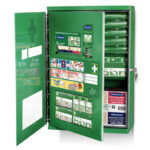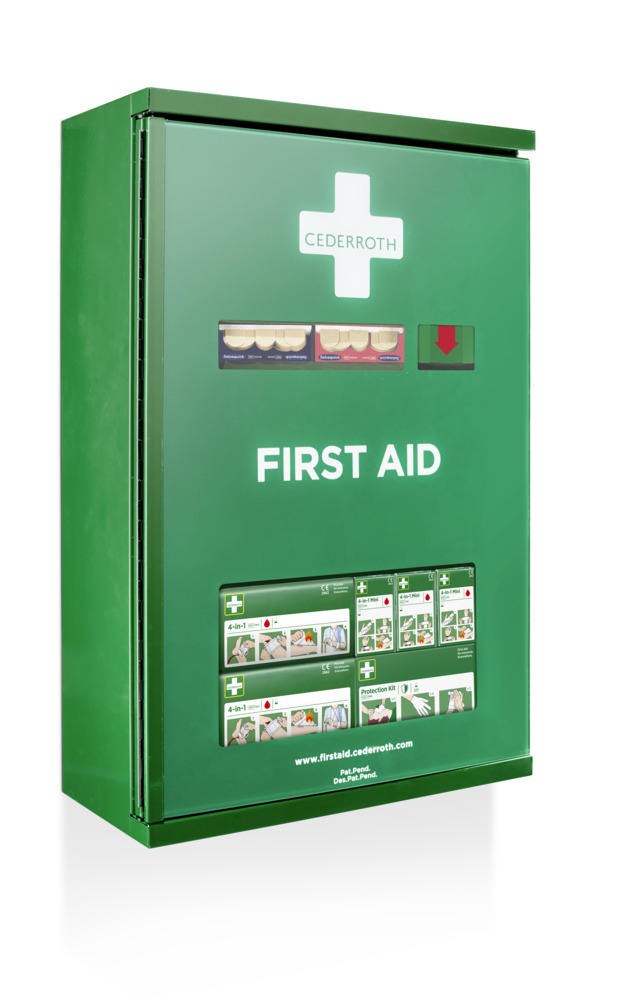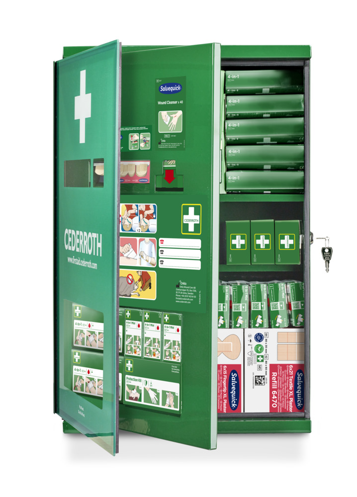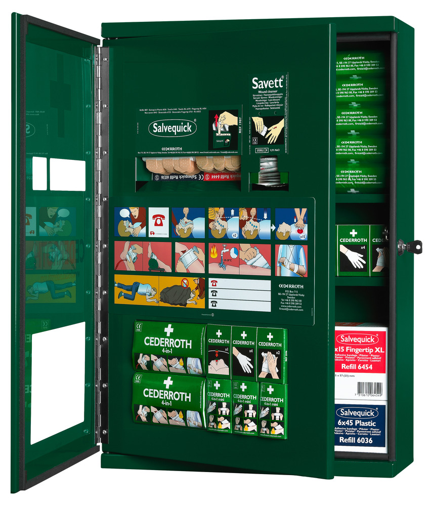 Cederroth Första Hjälpen-skåp är särskilt anpassade för arbetsplatser med utsatt miljö, t ex smuts, damm och fukt. Lämpar sig på platser där det finns anledning att ha en mer omfattande Första Hjälpen-utrustning. Skåpet är i plåt och har två dörrar som delar in skåpet i två sektioner. Den yttre sektionen är uppbyggd som en Första Hjälpen-tavla med lätt åtkomliga Första Hjälpen-produkter. En plexiglasdörr skyddar produkterna mot damm och fukt. Skåpets inre sektion består av ett låsbart utrymme med ett rejält lager av påfyllningsprodukter.
