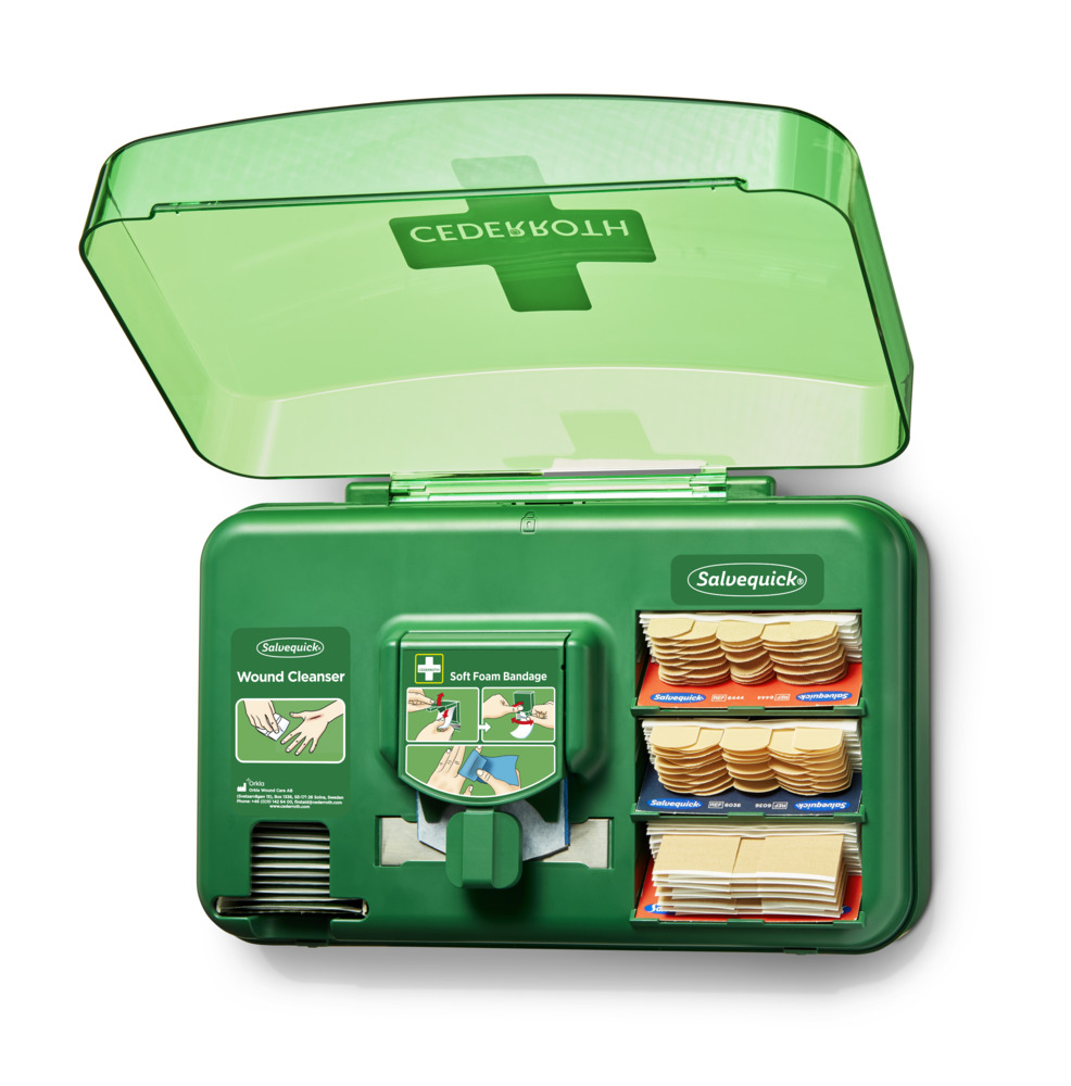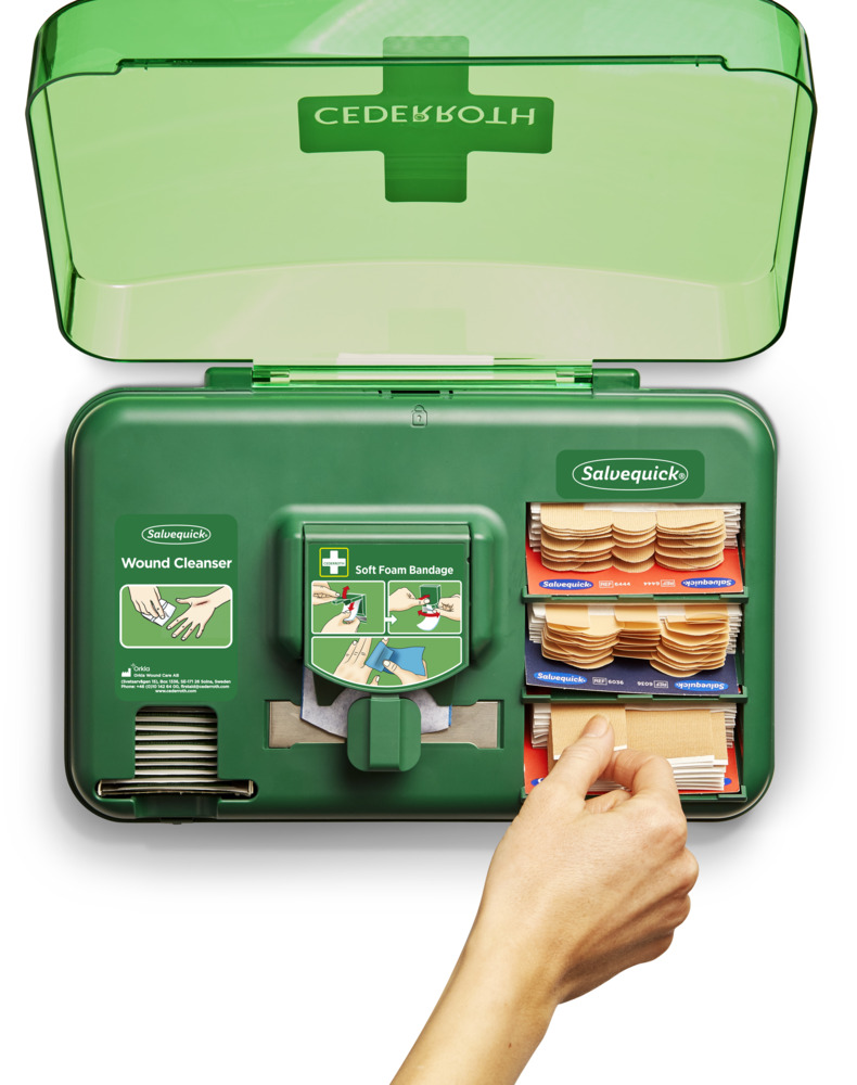 Det mesta du behöver för att ta hand om mindre sårskador i en praktisk dispenser. Smart komplement till övrig Första Hjälpen utrustning.