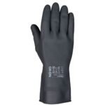 OX-ON Chemical Comfort 6300 är en svart kemskyddshandske för dig som arbetar med rengöring, kemi, fiske, i laboratorium eller inom livsmedelsindustrin. Arbetshandsken är 30 cm lång, har en tjocklek på 0,8 mm och skyddar både din hand och underarmen. Kemskyddshandsken är tillverkad i kraftig latex med ett diamantmönster i handflatan som ger ett mycket bra och säkert grepp. En rullkant ökar handskens stabilitet och gör det enkelt att ta på den snabbt. Chemical Comfort 6300 har en velouriserad insida som ger god komfort och gör det bekvämt att bära handsken under en längre tid. Latexhandsken är livsmedelsgodkänd, men rekommenderas inte för användning med oljebaserade kemikalier. OBS! Innan du arbetar med kemikalier, oljor, lösningsmedel etc. rekommenderas att du läser punkt 8 i säkerhetsdatabladet för den gällande produkten för att säkerställa rätt val av skyddsutrustning.