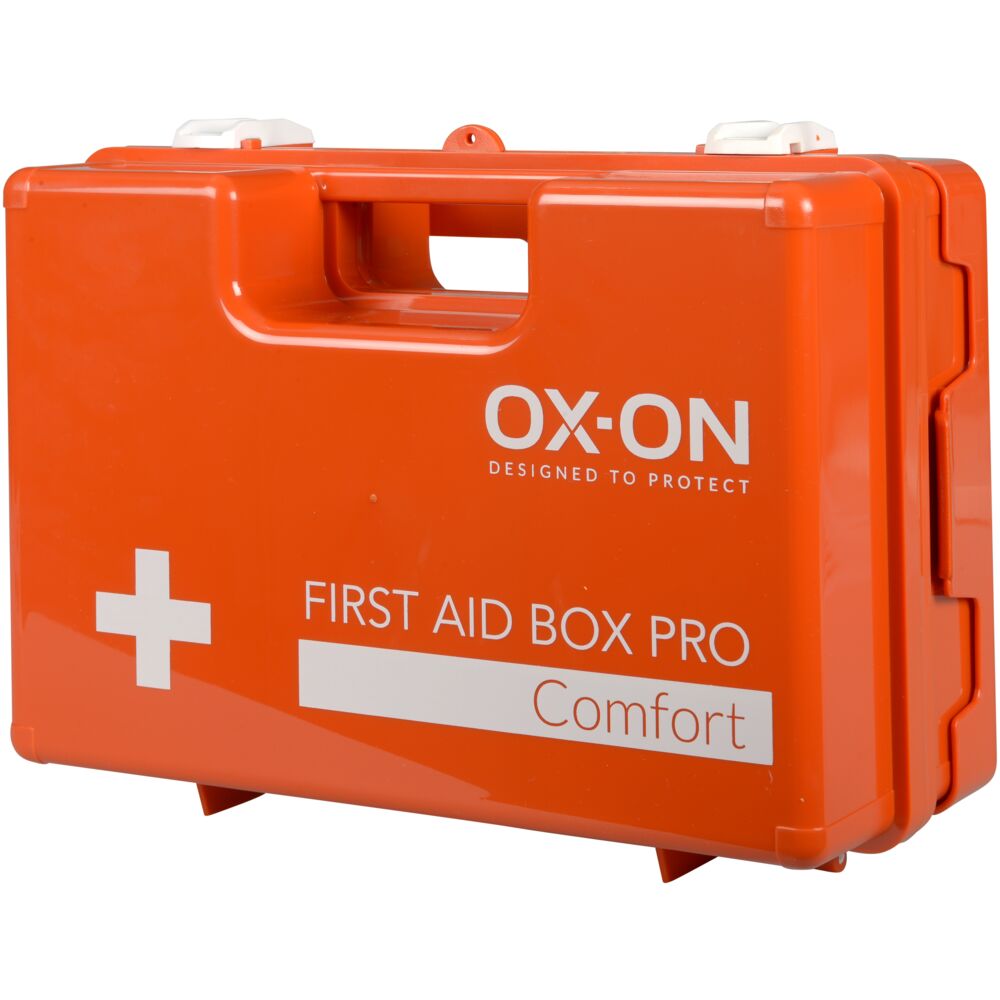 OX-ON First Aid Box Comfort är en välsorterad första hjälpen-låda för dig som vill vara säker på att kunna ge första hjälpen – oavsett var du befinner dig! Denna första hjälpen-låda är fylld med oumbärlig utrustning som du kan behöva vid både små och större olyckor. Du kan därför ha stor nytta av First Aid Box Comfort i till exempel boden, stugan, husvagnen eller i bilen. Låda innehåller: 1 st. plåsterrulle 2,5 cm x 5 m 4 st. elastiska plåster 10 × 6 cm 1 st. kompressförband 6×8 cm 2 st kompressförband 8×10 cm 1 st. kompressförband 10×12 cm 1 st. gaskompress 60 × 40 cm 1 st. gaskompress 60 × 80 cm 2st gasbinda 6 × 400 cm 3 st. gasbinda 8 × 400 cm 1 st. alu-matta 160 × 210 cm 6 st. gaskompresser 10 × 10 cm 2 st. mitellor 136 × 96 × 96 cm 10 st. Plåster i olika storlekar 2 st. sårrengöringsservetter 1 st. Metallsax 4 st. engångshandskar 1 st. Första hjälpen-handbok Du får alla delar levererade i en praktisk grön plastlåda, så att du alltid har utrustningen samlas när hjälp behövs. Lådan uppfyller kraven i den tyska DIN-standarden 13164.