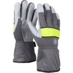 Vinterhandske med handflata i getskinn. Ovanhand i vind- och vattentät grå softshell (polyestermaterial). Vinterfodrad med 150 g Thinsulate samt Porelle-membran, vilket gör handsken helt vattentät. Knogskydd i fluorescerande gul neopren. 360° elastiskt band. Godkännande: Kat. I: EN 420